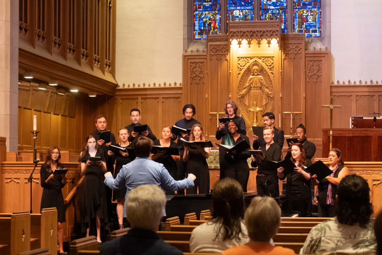 The West Michigan Choral Lab held performances of our most recent concert “Earth Songs” on August 24 and 25 of 2024. These were free to the public (with optional donations for those who were able and willing to contribute), and featured a chamber choir of young professional West Michigan-affiliated artists. Jamie Shackleton, a local indigenous visual artist, brought her nature-themed art to showcase and sell. The concerts were well-received, including comments that this was our “best concert yet” from frequent attendees. We are so grateful to the Puffin Foundation for making these concerts possible, and we’re excited to share some videos taken by Trenton Johnson and photos of the group by Reid Petro.
