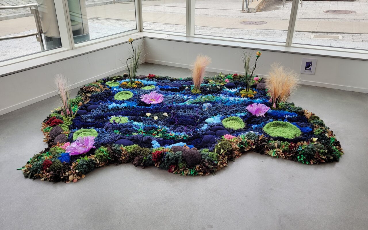 The concept consists of a tapestry floor installation, composed primarily of repurposed textiles, found objects, wire, and handmade ceramic elements, embellished with beads and held together on a rug mat . The work required approximately 450 hours of labor. Dimensions: 6W x 8L x 1.5H ft.